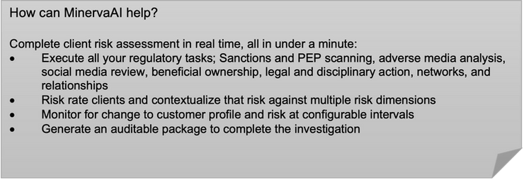 Firms like MinervaAI are led by professionals with deep knowledge of the regulations, the investigations process, and the machine and deep learning expertise to “plug and play” into your existing technology and process ecosystem. AI innovations coupled with cloud scalability allows investigators to do in minutes, what would traditionally take hours and days to do.