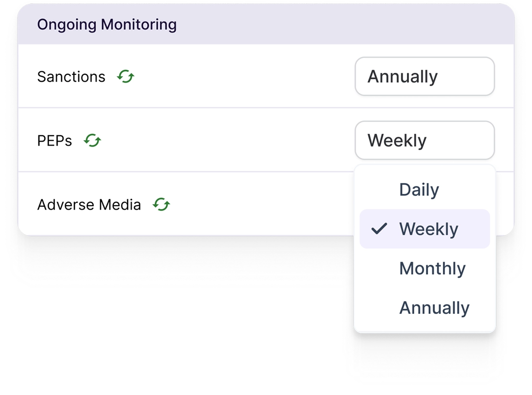 Stop worrying about monitoring deadlines. Schedule ongoing client screening at whatever cadence you need, whether weekly, monthly, or quarterly, and Minerva handles the rest.