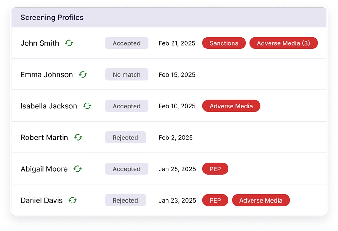 Onboard up to 96% of clients automatically with Sanctions, PEPs, and Adverse Media screening that is built to scale as fast as your business does.