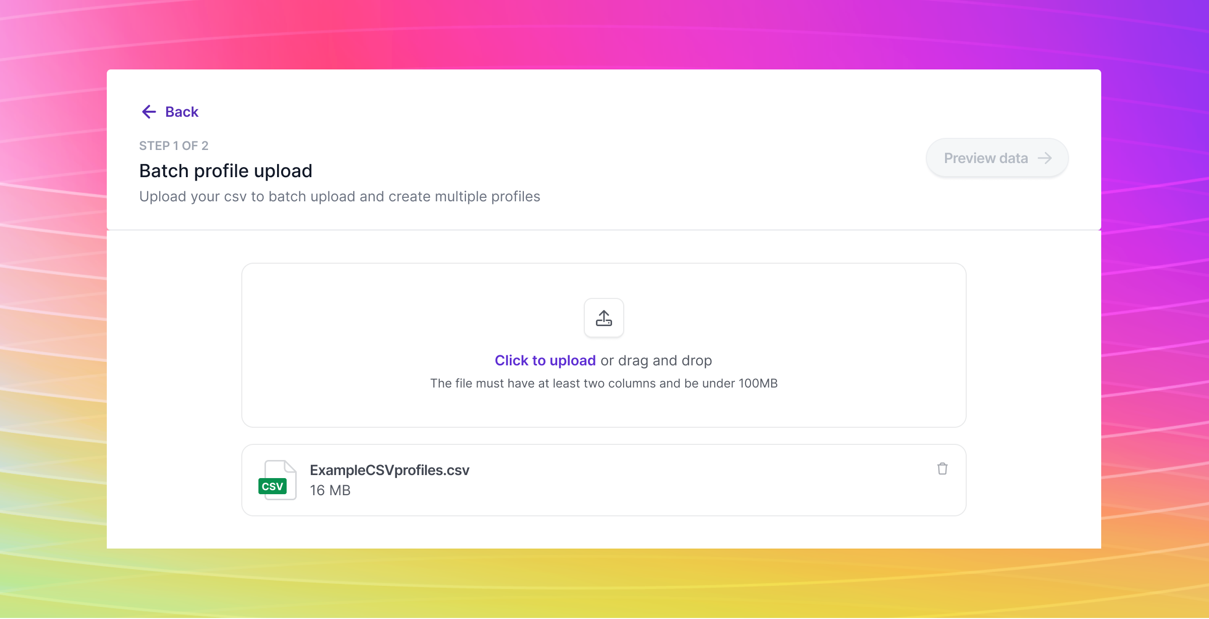 We designed and built a simple way to upload a list of up to 40,000 profiles at a time. Upon submission, Minerva will create a profile for each row and perform screening for each profile getting added to the system.