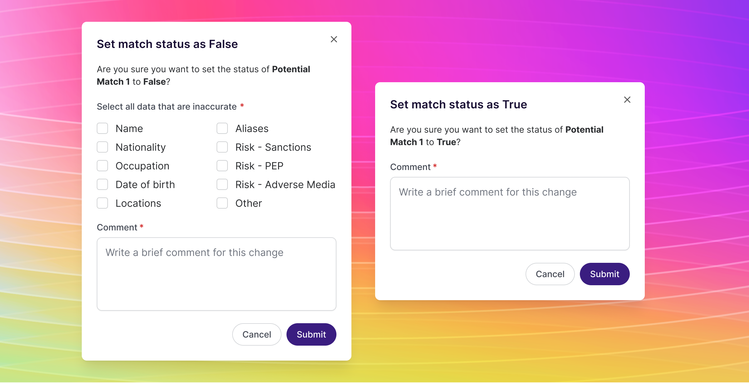 When an analyst or investigator determines if a potential match is true or false, we've added a modal with checkbox options and a comment field.
