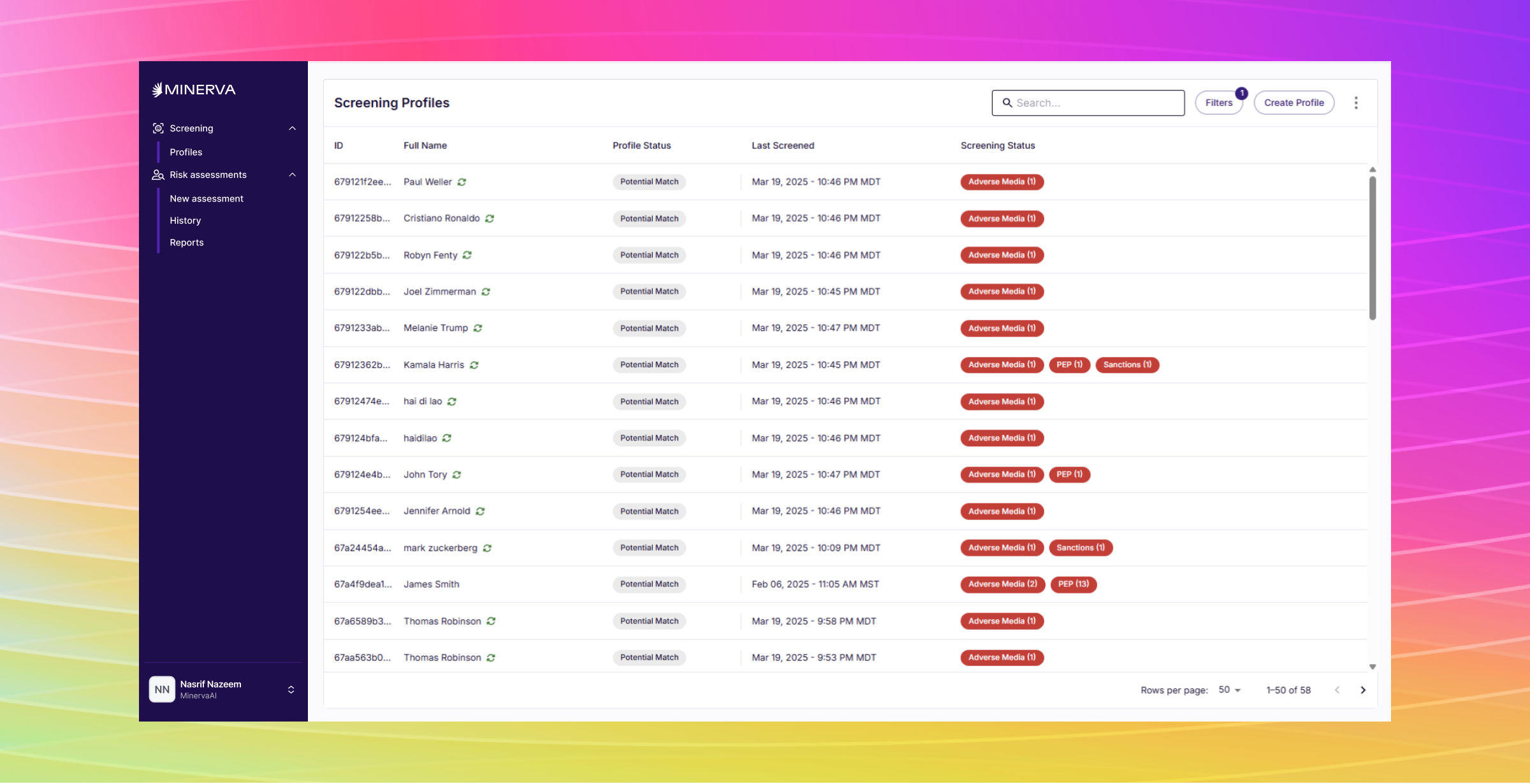 Our screening capabilities, previously in limited availability, are now accessible to all Minerva customers. This expansion ensures that every customer can leverage our comprehensive risk screening tools as part of their compliance workflows, providing consistent access to essential AML functionality across our entire customer base.