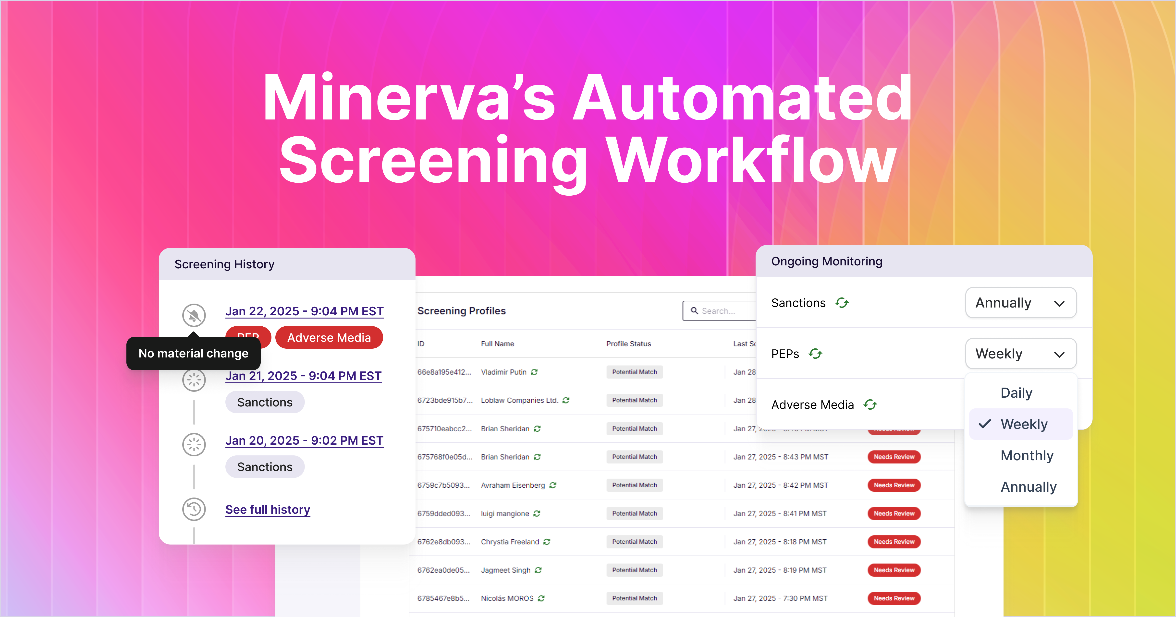 Configurable Monitoring Schedules: Set your screening cadence to align perfectly with your AML policy, and let Minerva automation handle the rest.