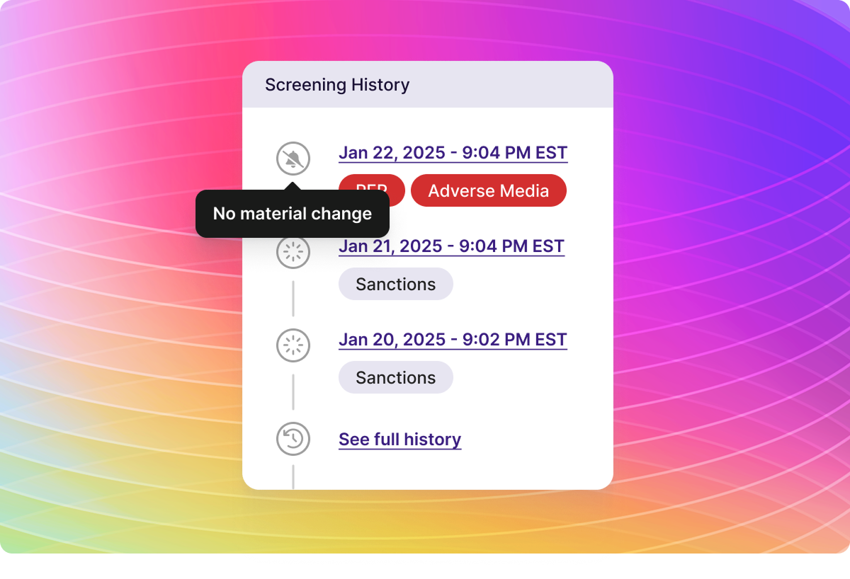Intelligent Alert Management: Minerva tracks past screening decisions to cut down on repeat alerts, notifying you only when something meaningful changes.